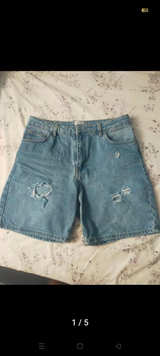 Mavi denim mini şort, bol kesim ve yırtık detaylarıyla günlük kullanıma uygun rahat bir stil sunar.