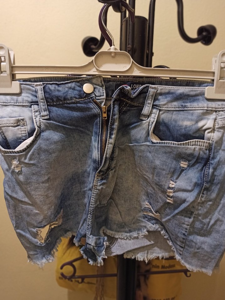 Gevşek kesim mavi denim mini şort, tokalı detaylıdır. Rahat kısa boyu ve günlük kullanıma uygun sokak modası stilindedir.