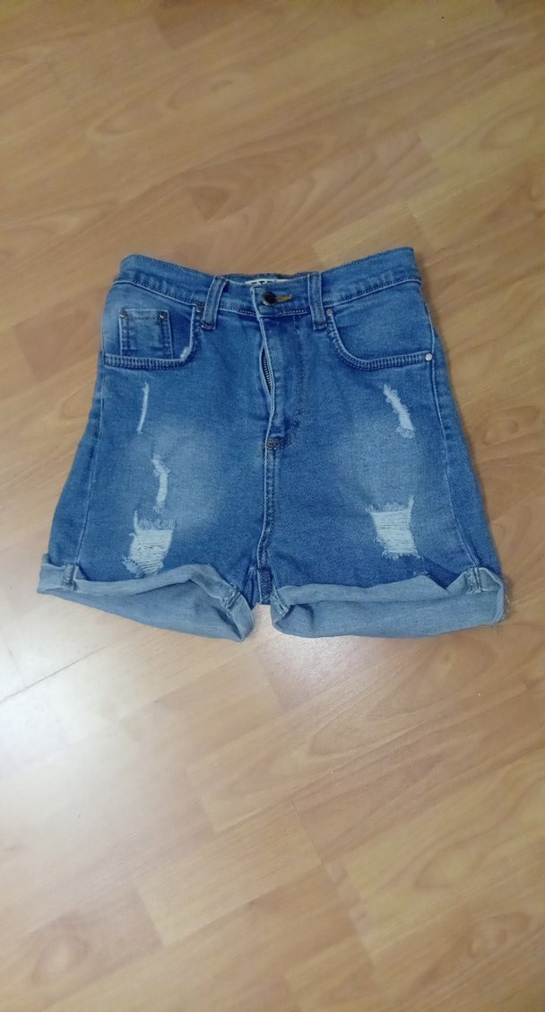 Mavi denim mini şort, bol kesim ve yıpratılmış detaylara sahip, gündelik kullanıma uygun rahat ve şık.