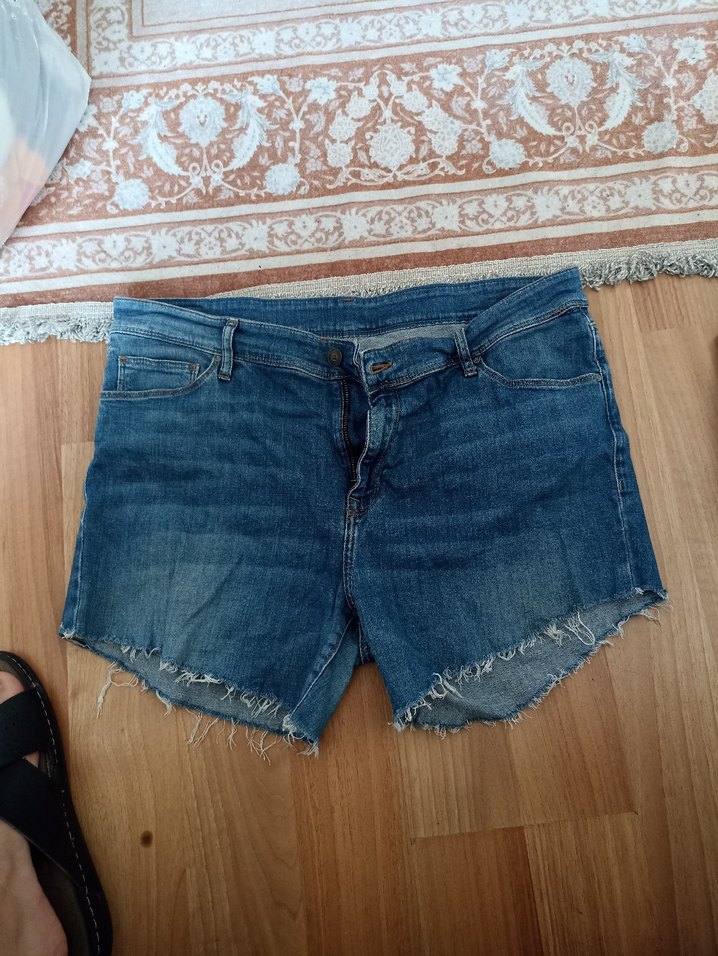 Kilo verdigim icin satiyorum. Mavi denim mini şort, bol kesim ve yıpranmış kenarlarla rahat ve şık bir günlük kullanım için uygundur.