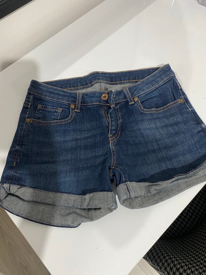 Kadınlar için mavi denim mini şort, belde tokalı detaylı, kısa paçalı ve günlük sokak tarzı için uygun.