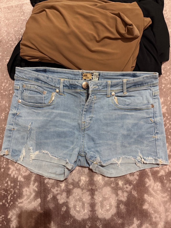 Mavi denim mini şort, fitted kesim ve yıpratılmış detaylara sahip. Klasik beş cepli tasarımıyla günlük sokak stiline uygun.