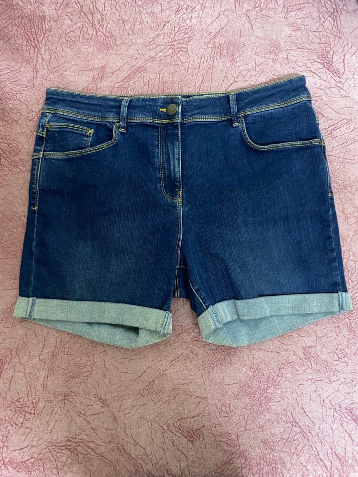 Kadınlar için pastel mavi renkli, kısa boylu ve katlamalı paçalı bol kesim denim şort, rahat dış mekan kullanımı için uygun.