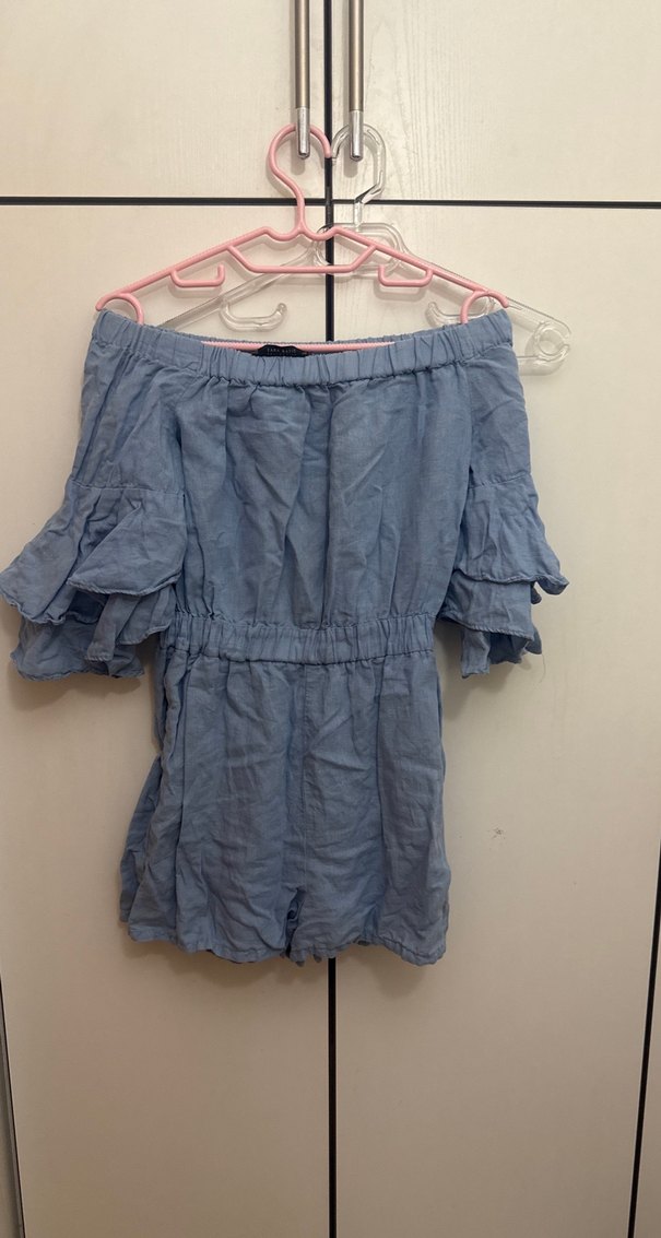 Kadınlar için mavi denim mini tulum, straplez yaka ve volanlı kısa kollara sahip, bol kesim ve rahat bir dokuda, günlük sokak modası için uygun.