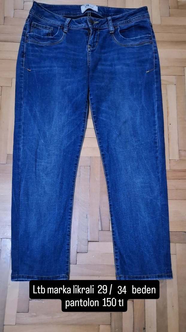 Mavi denimden yapılmış, normal boy ve regular fit kadın kot pantolon. Tokalı detay ve parlak yüzeye sahiptir, günlük kullanıma uygundur. Ltb markadır, beden 29/34.