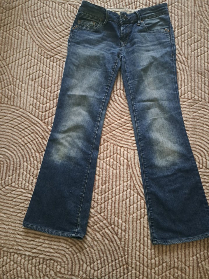Bu kadın mavi denim kot pantolon, normal boyda ve kemerli detaylıdır. Günlük sokak tarzı için uygundur. Beden 26/30 (Uzun süredir dolapta katlı olarak kaldığı için ütüsüzdür satış durumunda düzenleme yaparım)