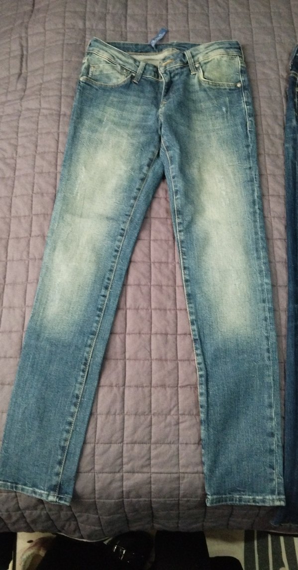 Kadınlar için mavi denim kot pantolon, normal boyda ve rahat kesim.