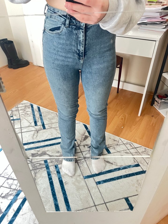 Kadınlar için normal boy, dar kesim mavi ve gri tonlarında batik desenli denim jean, gündelik normcore tarzda rahat kullanım sağlar.