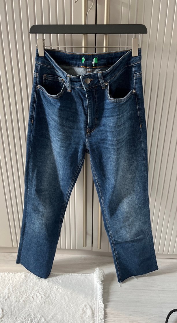 Kadınlar için mavi denim kot pantolon, normal kesim ve tokalı detaylı. Midi boyda, desen içermeyen günlük kullanım için uygundur. Benetton markalı olmadığı için satıyorum orijinal benetton