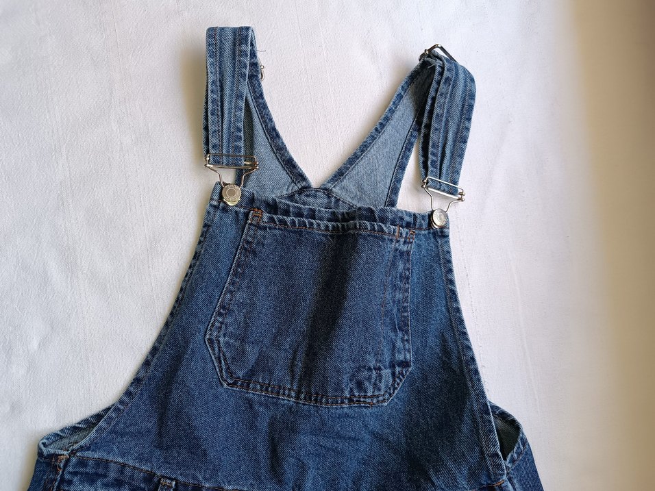 Rahat kesim, mavi denim salopet pantolon tulum . Ayarlanabilir tokalı askılar ve ön cep bulunur, gündelik sokak stili için uygundur.