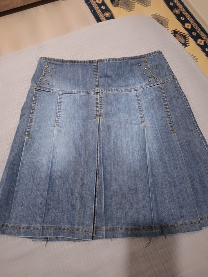 Kadınlar için mavi denimden yapılmış, pileli ve bol kesim mini etek. Günlük ve sokak stiline uygun, normal uzunlukta ve desensiz.