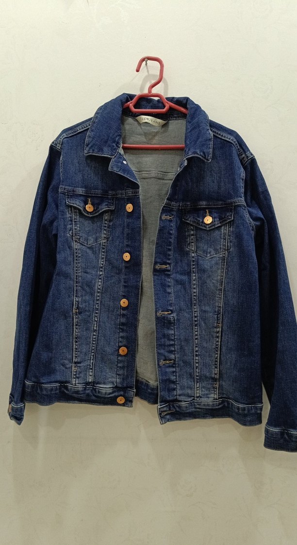Düğmeli, uzun kollu, rahat kesim mavi denim ceket. Normal boy, çentikli yakalı ve günlük kullanıma uygun sokak stili.