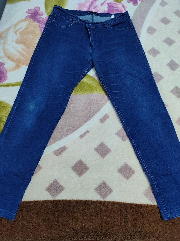 Mavi denim, regular fit kadın jean. Normal boy, hafif batik desenli ve kemer tokalı, günlük rahat kullanım için uygundur.