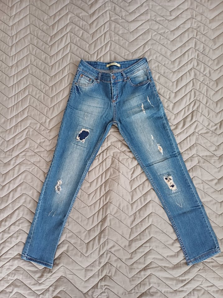 Kadınlar için mavi denim kot pantolon, regular fit ve normal boy. Yırtık detaylı ve tokalı tasarıma sahip, günlük rahat kullanım için uygundur.