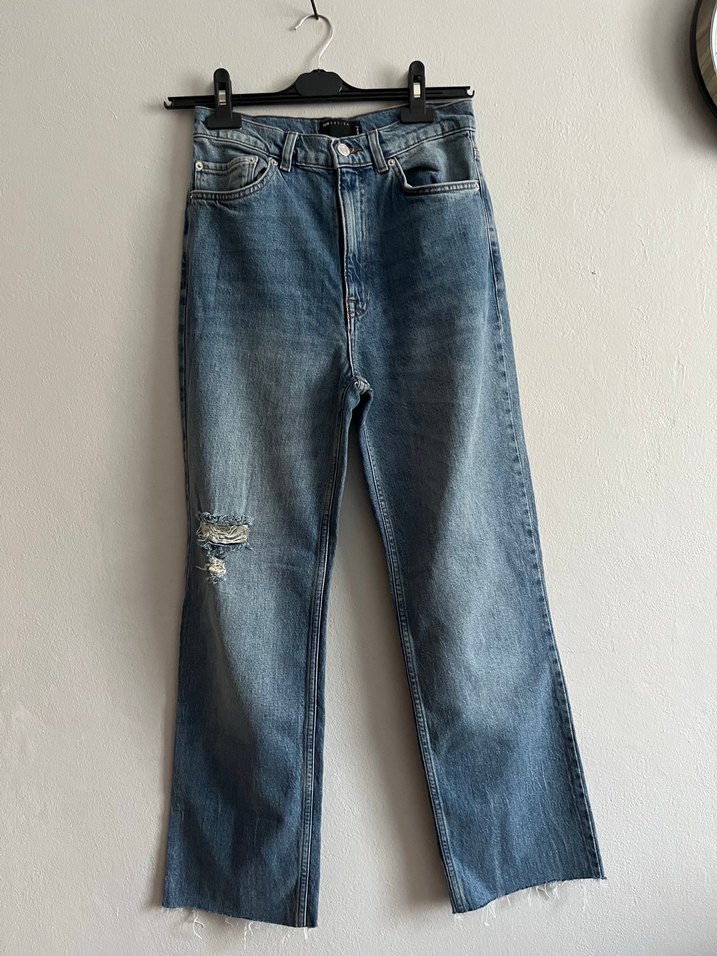Mavi denim, regular fit, midi boy kadın jean. Sokak stiline uygun, günlük kullanıma uygun, kemer detaylı. Bir bacakta hafif yıpranmış görünüm var.