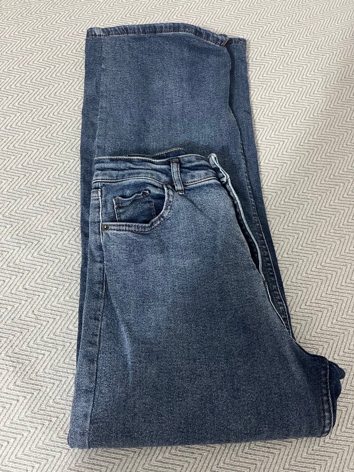 Kadınlar için mavi denimden yapılmış, regular fit ve midi boy kot pantolon. Tokalı detaya sahip, gündelik kullanım için uygun, desensiz tasarım. az kullanıldı. esnek pantolon
