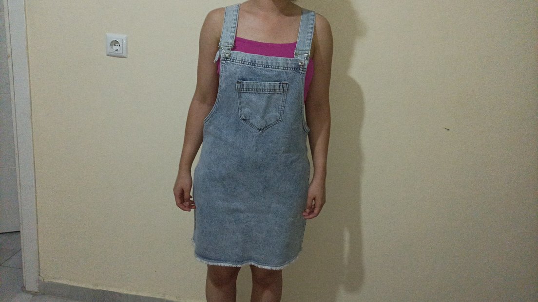 Fitted kesim, askısız mavi denim salopet elbise, günlük rahat kullanıma uygun, sokak modası stilinde şık ve pratik bir parça.