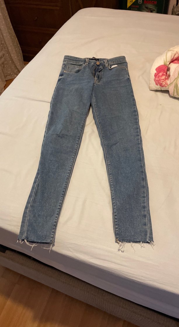 Bu kadın mavi denim skinny jean, midi boy uzunluğa ve salaş bir sokak stili görünümüne sahiptir. Düz desensiz, hafif yıpranmış paça ile zahmetsiz şıklık sunar, günlük kullanım için uygundur.