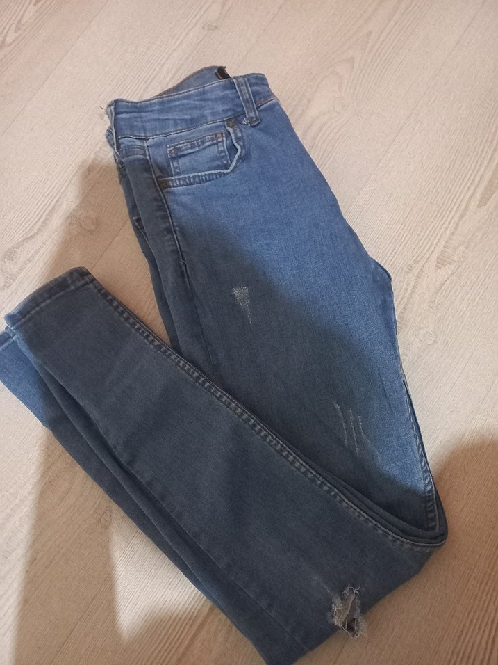 Kadınlar için mavi denim skinny jean pantolon. Normal boyda, yırtık detaylı ve günlük kullanım için uygun rahat bir tarza sahip.
