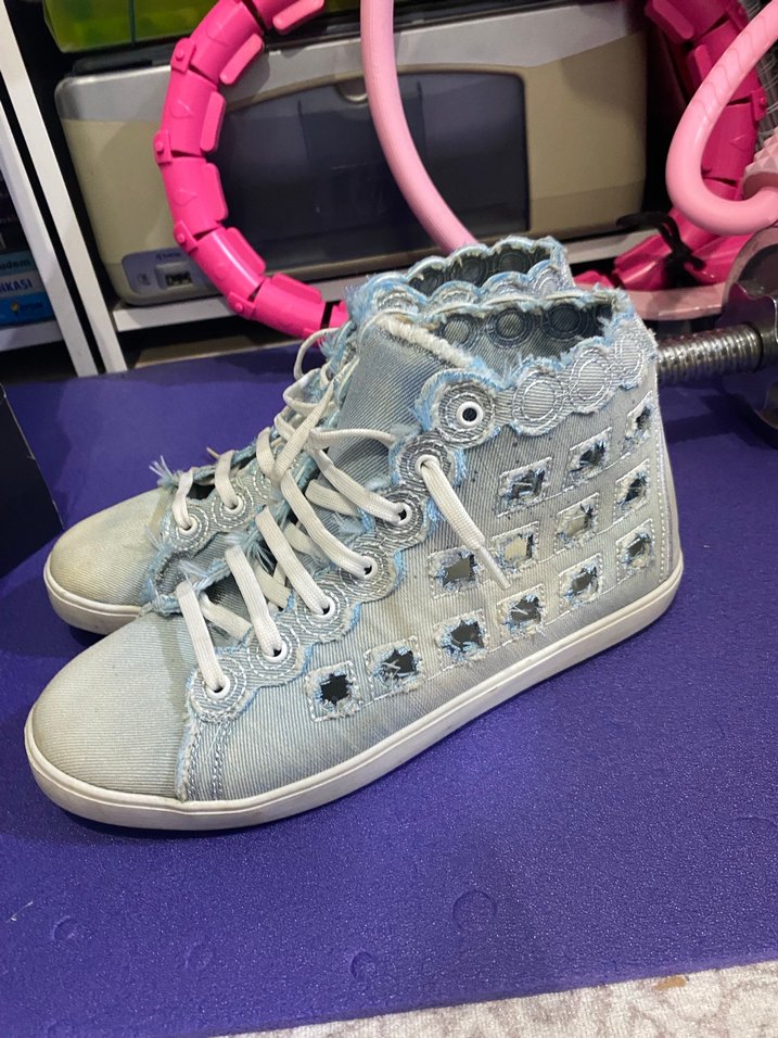 Mavi denimden yapılmış, renkli nakış detaylı, yüksek topuklu ve bağcıklı kadın spor ayakkabısı. 40 numara az kullanıldı.