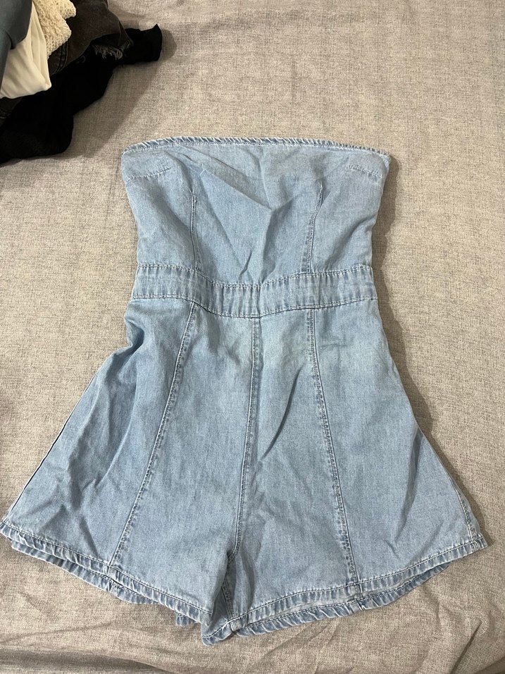 Düğmeli, straplez ve vücuda oturan denim tulum, midi boyda ve gündelik sokak stili için uygundur. Bohem ve retro tarzı yansıtır.