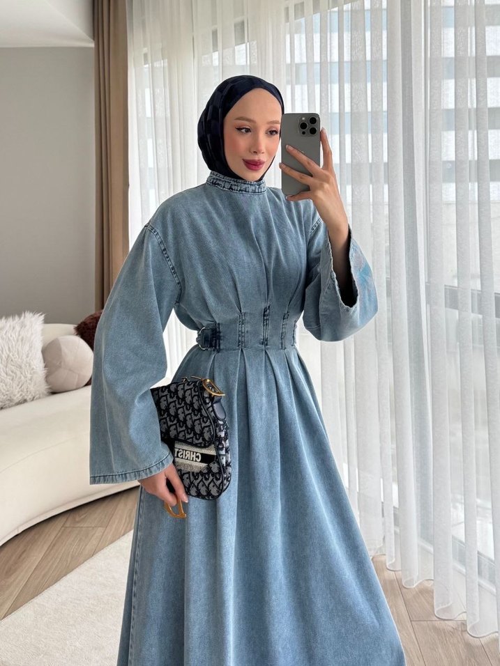 Bol kesim, yüksek yakalı ve uzun kollu mavi denim uzun elbise. Belden kemerli ve hafif mavi batik desenlidir, günlük kullanıma uygundur. Beden aralığı 38.40.42.44.46.