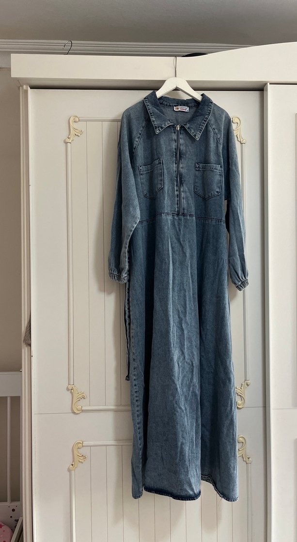 Kadınlar için mavi denim uzun elbise, bol kesim ve uzun kolludur. Fermuarlı önü, yakası fermuar detaylıdır. İki göğüs cebi bulunur, günlük rahat kullanıma uygundur. Boy:135cm İki kol arası:60 cm
