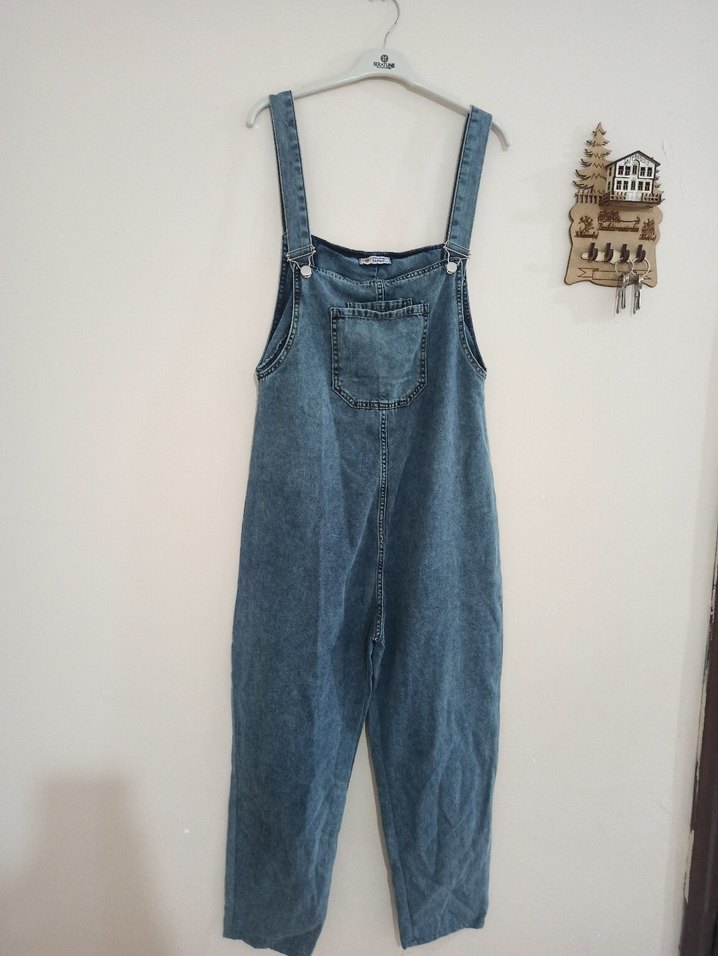 Mavi denim kumaştan, askılı ve yuvarlak yaka uzun kadın salopet. Midi boyu ve bol kesimiyle günlük kullanıma uygun, zahmetsiz şıklık sunar.