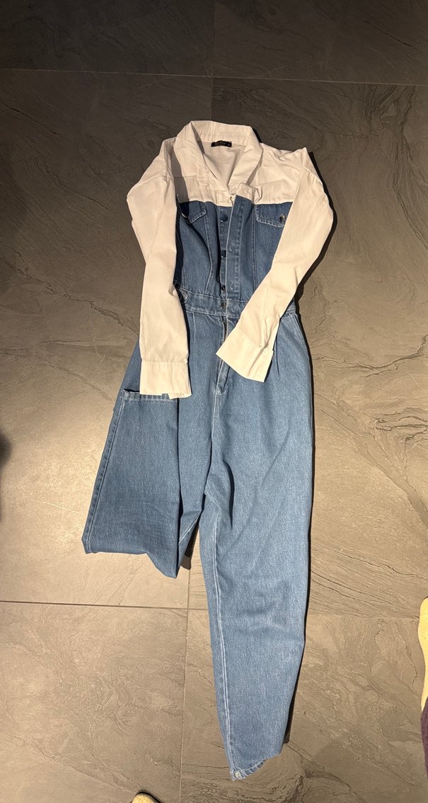 Kadın uzun tulum, rahat kesim, kemerli bel, uzun kollu ve straplez yakaya sahip. Yumuşak denim kumaştan, günlük rahat sokak stili için pastel mavi renkte.