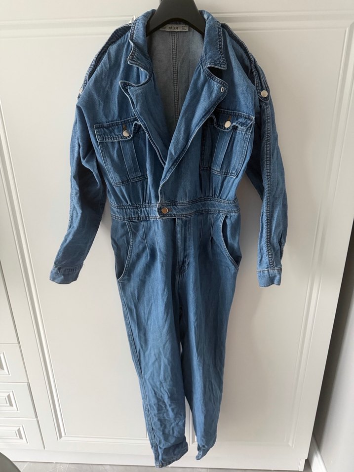 Kadınlar için uzun, bol kesim denim tulum. Uzun kollu, düğmeli ve çentikli yaka detaylı, vintage sokak stiliyle günlük kullanıma uygun.