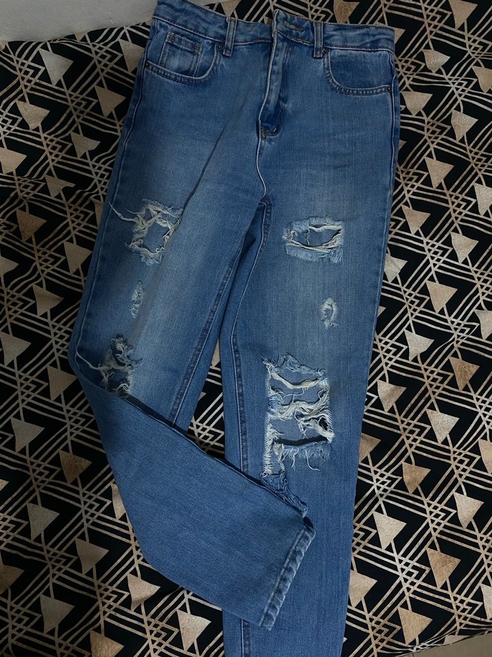 Yırtık detaylı, kemerli bel ve bol kesim mavi denim pantolon. Günlük sokak stili için midi boy ve desensiz.