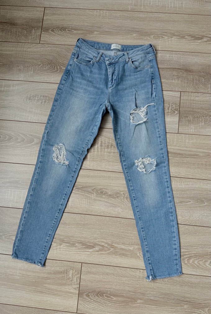 Günlük kullanıma uygun, yırtık detaylı ve kemerli, normal kesim mavi denim jean pantolon. Midi boy ve normcore tarzda.