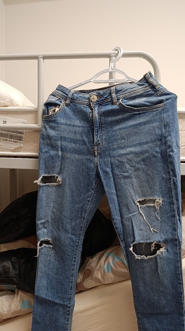Mavi denim kumaştan, yırtık detaylı, salaş kesim kadın jean. Normal midi boyda, günlük kullanıma uygun, sokak stili için ideal.