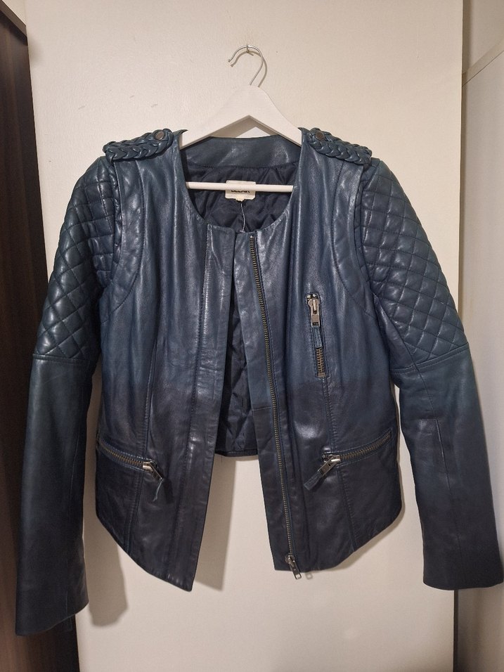 Koyu mavi deri biker ceket, kesik yaka, bantlı kollar ve kuşaklı tasarıma sahiptir. Normal midi boyda, günlük kullanıma uygun.