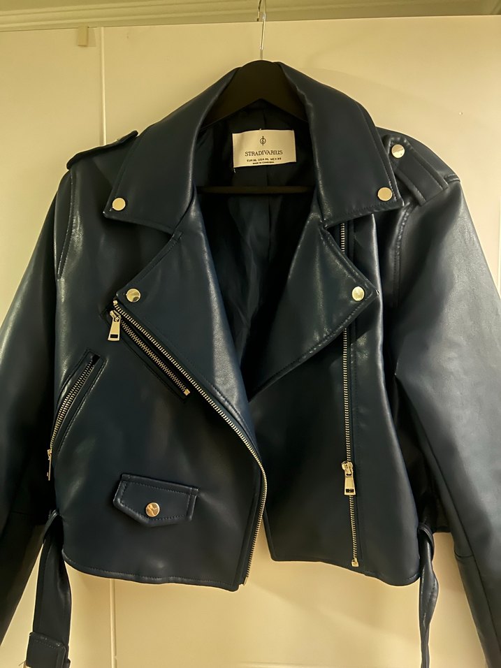 Fitted kesim mavi deri biker ceket, notched lapel, tokalı detaylar ve askılı kollara sahip, günlük şıklık için ideal.