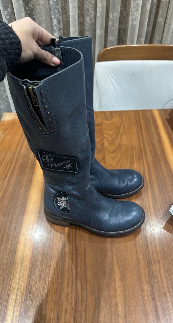 Mavi deri, kilitli ve işlemeli yamalarla süslenmiş biker tarzı kadın diz boyu çizme. İşlemeri el işi özel tasarım çizme. Çok az giydim. Deformesi yok . Gerçek deri