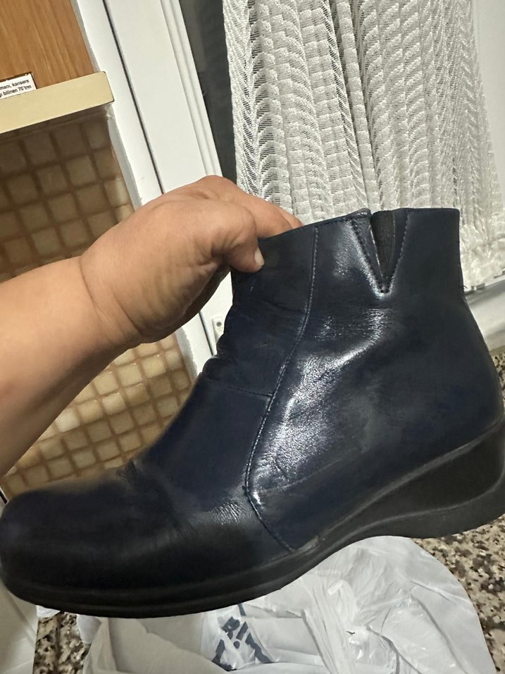 Parlak mavi deri ile dolgu topuklu ve tokalı kadın botu, günlük kullanıma uygun, rahat ve şık bir tasarıma sahiptir.
