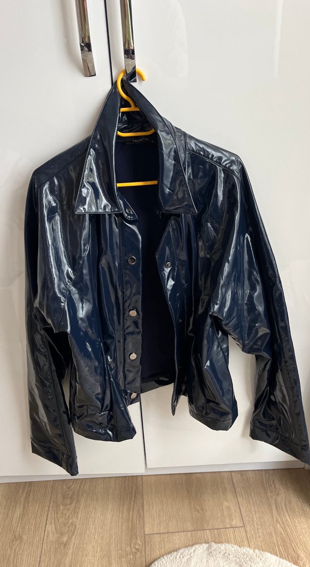 Kadınlar için koyu mavi deri, düğmeli, kesik yaka ve bol kesim midi uzunluğunda ceket. Uzun kollu, sokak modasına uygun.