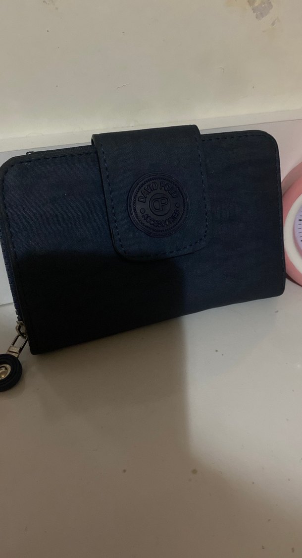 Koyu mavi deri cüzdan, baskılı desene ve fermuarlı kapanışa sahip. Günlük kullanım için uygun hiç kullanılmamıştır.Hiçbir sorunu yoktur.