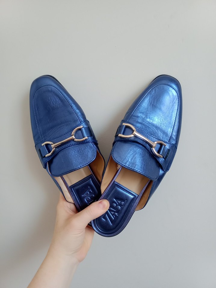 Kadınlar için mavi deri tokalı terlikler, parlak yüzey ve blok topuklu. Desensiz, sokak stili ve günlük kullanım için uygun.