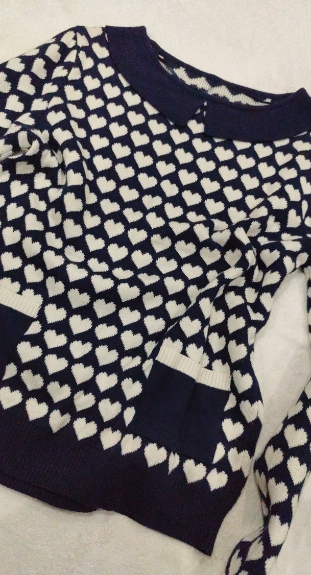 Bu koyu mavi örgü kazak, desenli ve uzun kolludur. Pamuktan üretilmiş, rahat ve normal boyda, günlük sokak stili için uygundur.