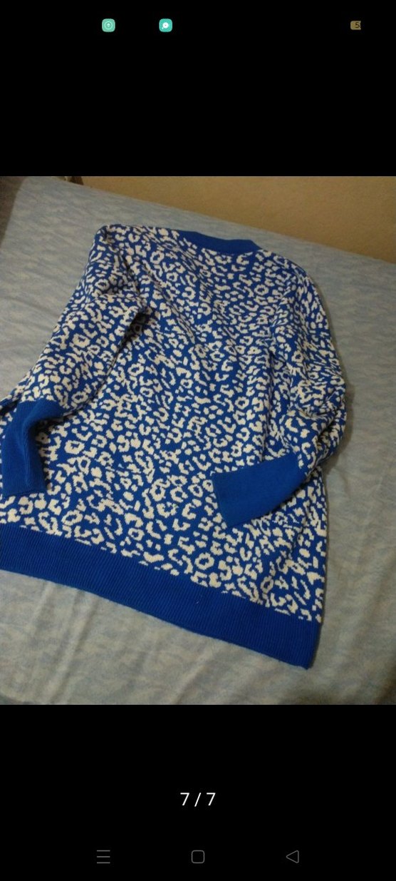 Kadınlar için mavi ve beyaz desenli, uzun kollu, rahat kesim triko kazak. Yuvarlak yakalı ve günlük kullanıma uygun. mavi leopar desenli ön kısmında hafif leke mevcut oda dolapta durmaktan oldu sanırım m/l beden uyumlu
