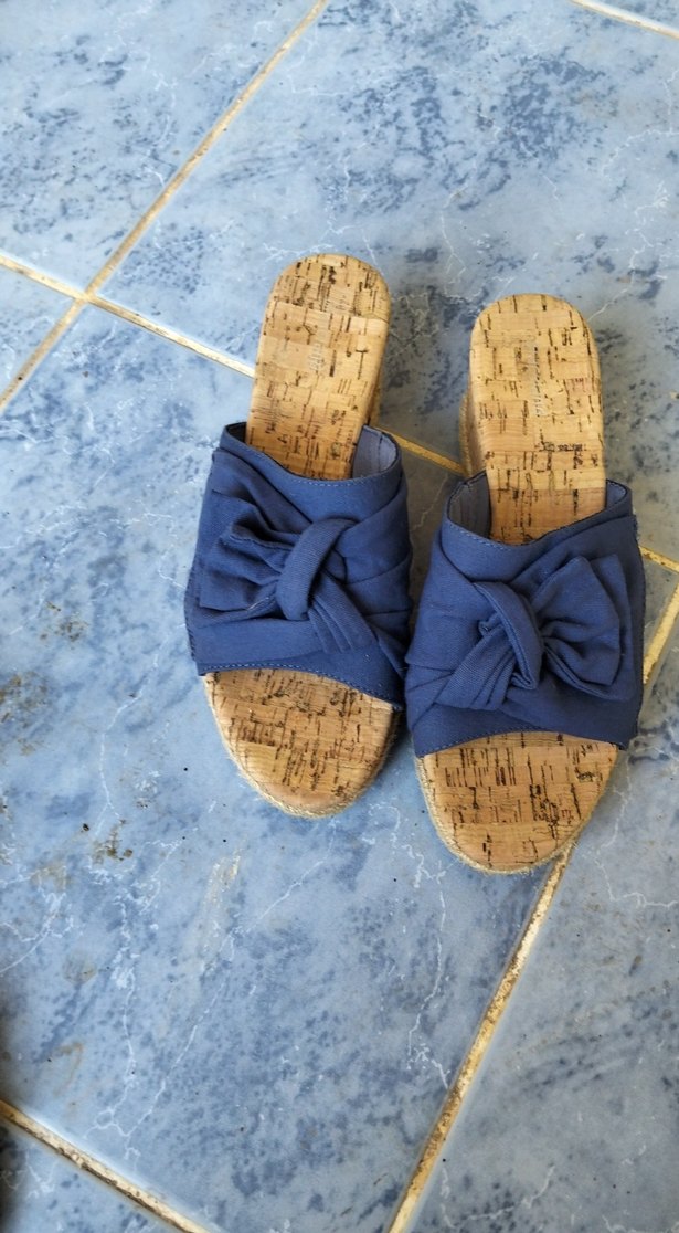 Mavi dolgu topuklu espadril terlik, mantar taban ve tokalı kumaş bantlarla rahat ve bohem tarzda günlük kullanım için uygun.