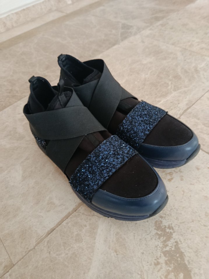 Koyu mavi renkli, dolgu topuklu ve kadın spor ayakkabısı. Dış mekan ve sokak tarzı için uygun, dayanıklı kauçuk tabanlı.