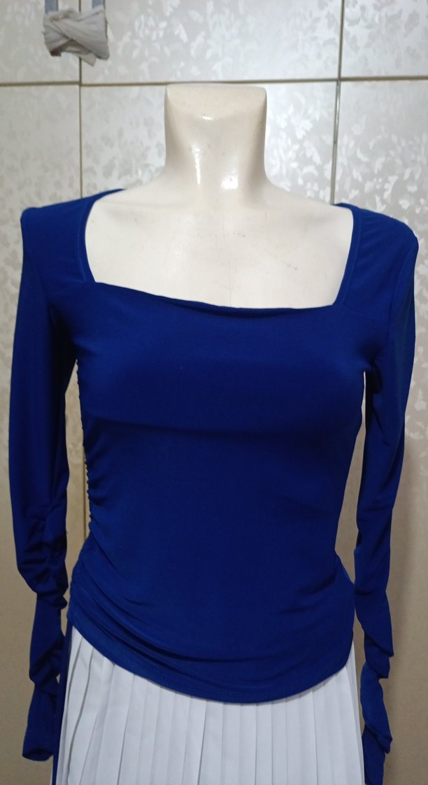 Bu dar kesim mavi bluz, tekne yaka ve uzun kollu, drapeli tasarıma sahip, yumuşak likralı kumaştan üretilmiştir, ofis için uygundur.