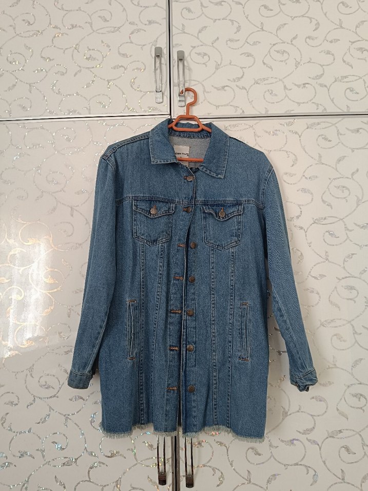 Hiçbir deformesi yoktur ✨ İsteğe bağlı detaylı görsel atılır✨ İade yoktur. Düğmeli, uzun kollu ve bol kesim kadın denim ceket. Çentikli yaka ve midi boyda, günlük rahat sokak stili için uygun, desensiz mavi renkte.