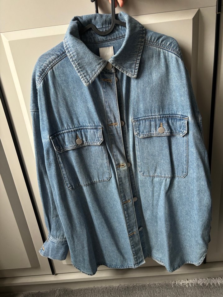 Kadınlar için mavi denim ceketin bol kesimi, uzun kolları ve kesik yaka detayı vardır. Düğmeli önü ve iki göğüs cebiyle günlük sokak stili sunar.