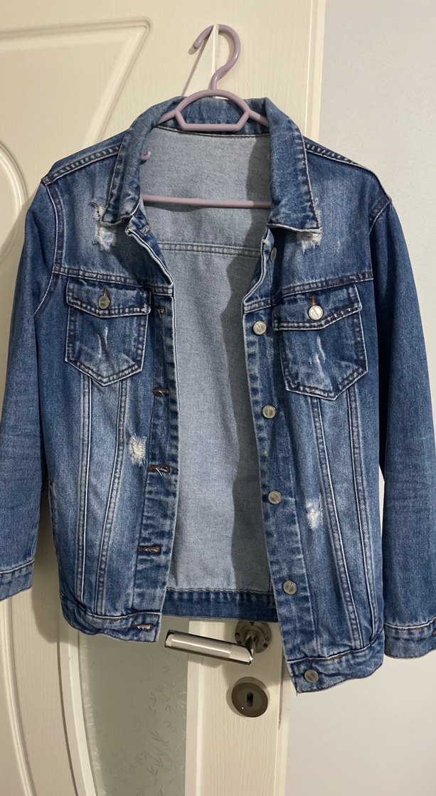 Mavi denim kumaştan, düğmeli ve bol kesim kadın ceket. Uzun kollu ve yaka detaylı, günlük rahat kullanıma uygun.