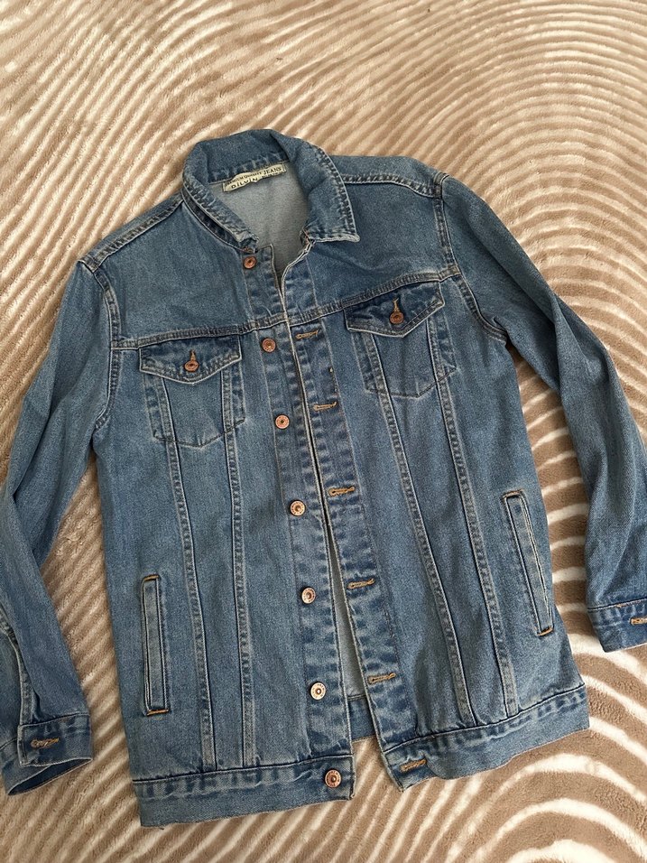 Kadınlar için normal kesim, düğmeli ön ve düğmeli manşetlere sahip mavi denim ceket. İki göğüs cebili, notched yaka ve uzun kolludur, günlük kullanıma uygundur.
