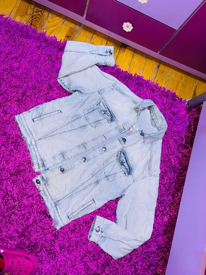 Düğmeli, uzun kollu, normal boyda bol kesim mavi denim ceket. Sokak stiline uygun rahat tasarım.